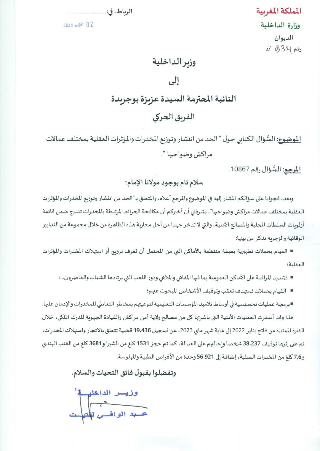 عزيزة بوجريدة نائبة برلمانية عن الفريق الحركي تتلقى كتابا من وزير الداخلية حول الاتجار والاستهلاك في المخدرات بمراكش