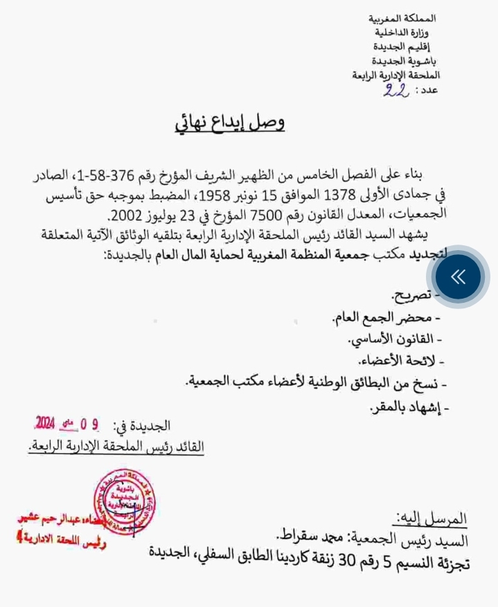 توصلت المنظمة المغربية لحماية المال العام بحر هذا الأسبوع على وصلها نهائي من طرف وزارة الداخلية بعد انعقاد مؤتمرها الوطني الاستثنائي ببوزنيقة أيام 16- 17-18 فبراير 2024 بعد انتخاب رئيسها الوطني ذ. محمد سقراط وقيادة وطنية تتمثل في أعضاء مكتبها مشكلة من قطاع المحاماة بهيئات مختلفة وأطر وخبراء تنزيلا كما جاء به الفصل 12 من الدستور حيث تُؤسس جمعيات المجتمع المدني والمنظمات غير الحكومية وتمارس أنشطتها بحرية، في نطاق احترام الدستور والقانون وفي مقدمتها المنظمة المغربية لحماية المال العام.